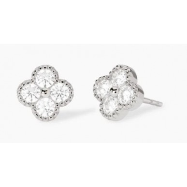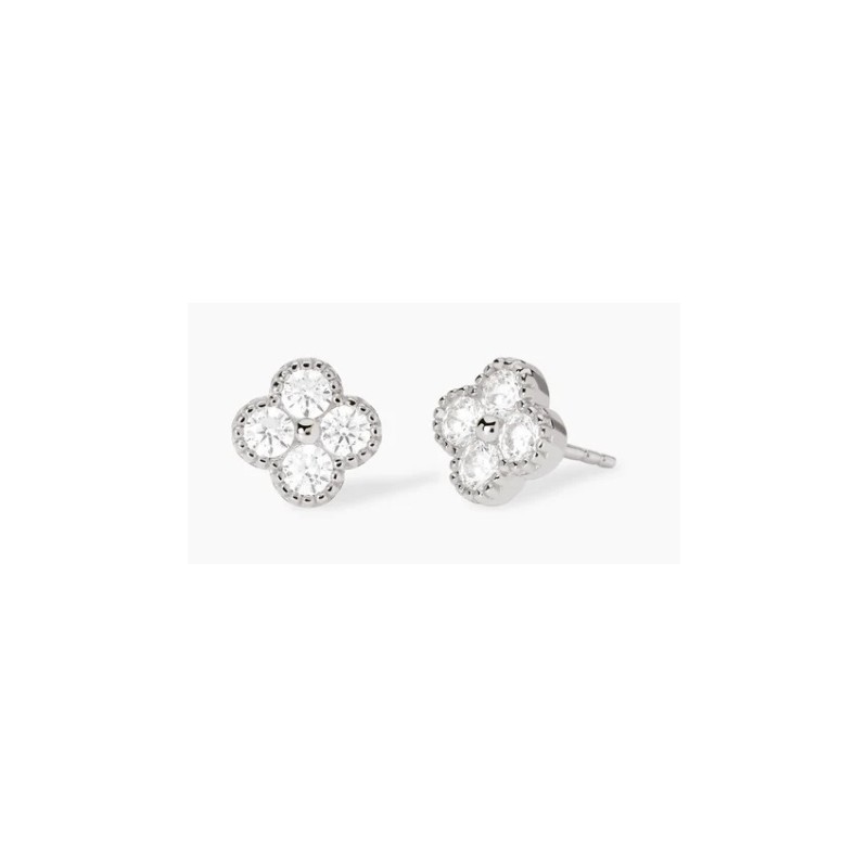 Descripción del producto Pendientes de botón de plata con forma de flor en circonitas blancas. • Tamaño de la flor: 9x9 mm • Diámetro de la circonita: 3 mm • Material: plata bañada en rodio 925, circonita