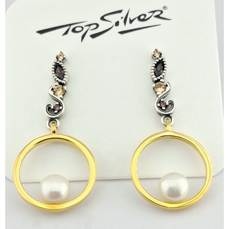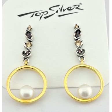 Pendientes para mujer colgantes fabricados en plata de 1ª ley 925mls y el circulo en plata bañado en oro de 18kilates , pendientes colgantes con piedras naturales largo total 41,00mm y de diametro el colgante redondo 19.40mm y con perla botón cultivada de agua dulce y cierre a presión