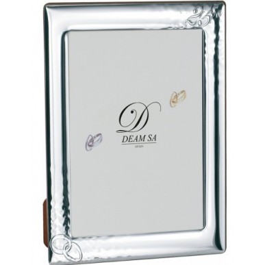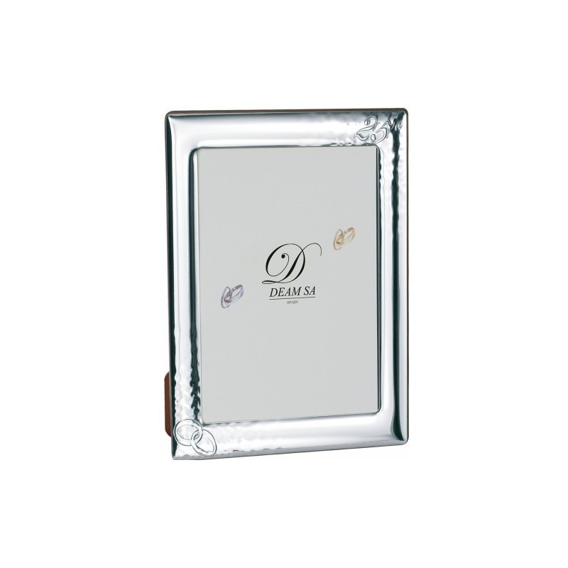 Portafotos de 25º anivesario ,fabricado con revestido de plata pura bilaminada utilizando la tecnologia PVD de conformidad con la ley , tamaño de la foto 18x24 cm , medida del marco exterior 29x24cm y de galeria 3 cm . terminado en brillo con un toque de martele. La parte trasera terminada en madera.