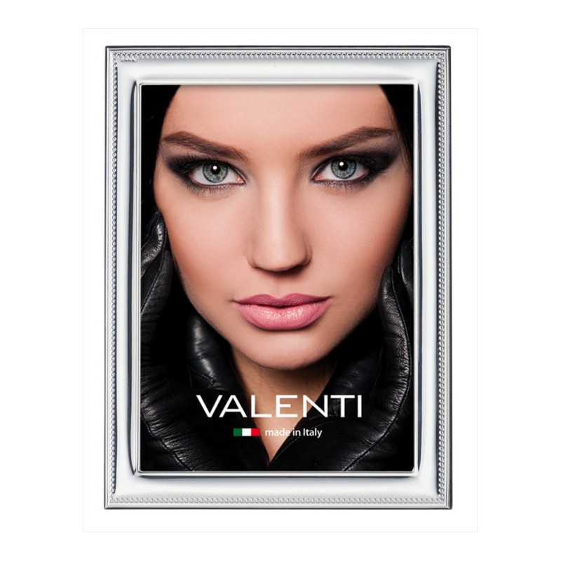 Portafotos revestido en plata con tecnología PVD conforme a la normativa de ley vigente, la galeria el acabado es en brillo y con bolitas en la galeria exterior. La parte trasera es en madera lacada.