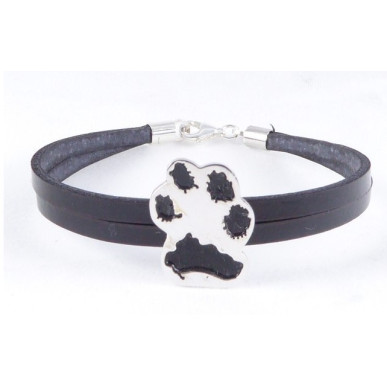 Esta pulsera esta fabricada a mano en nuestro taller , con un grosor de 1,3mm en plata de 1ª ley 925 mls y correa de piel en negro , la huella esta recortada a mano con arquete y oxidada color negro .