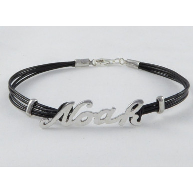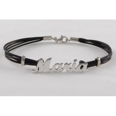 Ésta pulsera esta fabricada a mano en nuestro taller , con un grosor del nombre de 1mm y de alto de letras , la mayuscula 9 mm y las minusculas 5,5 mm en plata de 1ª ley 925 mls , el acabado es en brillo y con baño de rodio para dar mayor resistencia, la joya de plata que recibe una capa de rodio posee una vida útil más larga, mayormente, contra arañazos , puede hacerse con el nombre que quieras , se sirve en 4 tiras de piel en color negro , marrón o rojo color a elegir , de un grosor de 1mmy en distintas medidas de muñeca 13 cm 16 cm y 18 cm 20 cm .