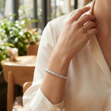 Elegante brazalete tipo esclava fabricado en plata de ley 925 con un distintivo diseño de nervaduras. Una pieza de joyería sofisticada que combina durabilidad técnica con un acabado brillante y atemporal.