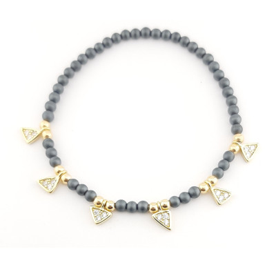 Pulsera de plata de primera ley (925) chapada en oro amarillo de 18kt con circonita blanca y hematites. Entre la dulzura y la sofisticación esta pulsera nos enseña como cambia cada pieza del puzle según el lado en que es observado y el bello conjunto que todos ellos crean juntos.