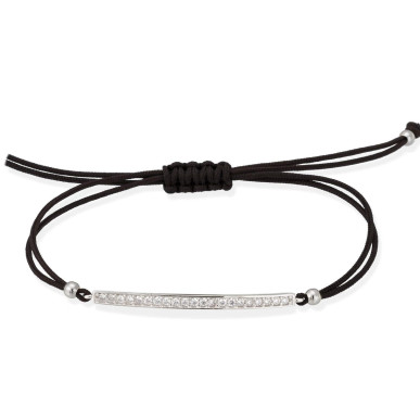 Pulsera de plata de primera ley (925) con baño de rodio y circonita blanca.Con hilo de rayón negro (medida extensible: de 15 a 23 cm.)