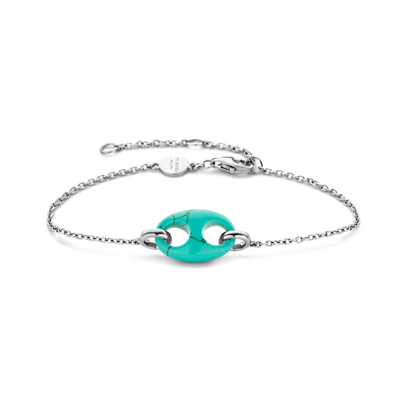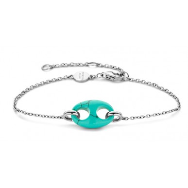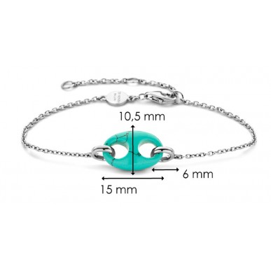 Esta pulsera de plata TI SENTO - Milano 2982TQ ostenta un token de grano de café turquesa como pieza central. Una forma clásica con un toque colorido y divertido. El brazalete está elaborado en plata de ley 925 y recubierto con una capa de rodio para protegerlo y mantenerlo luminoso. La pulsera es ajustable para asegurarse de que se ajuste perfectamente.
