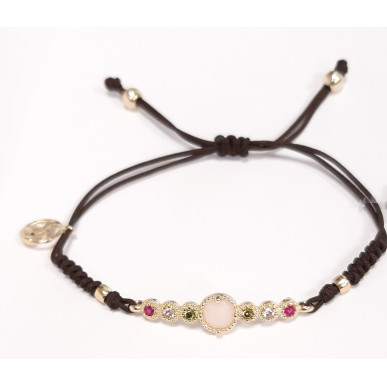 Pulsera para mujer en plata de 1ª ley 925 mls de la marca Top Silver, con piedras de colores con montura en grapa y abalorios en baño de oro amarillo , hilo Naylón en color marrón ajustable a la medida de la muñeca