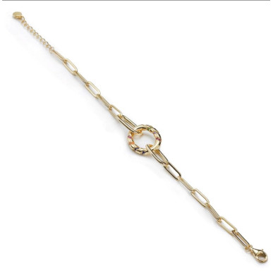 Pulseras finas de plata para mujer. Un diseño simple que dará un toque de color a tus looks. Pulseras finas de plata bañada en oro diseño de cadena paper clip con motivo circular y detalle de circonitas de colores. Perfecto para lucir junto al collar a juego.