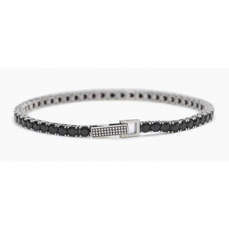 Descripción del Producto Pulsera tenis en plata rodiada con circonitas negras. • Engaste de las circonitas con puntas de cuatro puntas • Diámetro de las circonitas: 3,50 mm • Cierre con resorte con textura tachonada • Tamaño pequeño, longitud 19 cm • Material: Plata 925, Circonitas