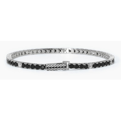 Descripción del Producto Pulsera tenis para hombre en plata bruñida con circonitas blancas y negras alternadas. • Tamaño mediano, longitud 20 cm • Diámetro de las circonitas: 3 mm • Engaste de las circonitas con puntas de cuatro puntas • Cierre de broche con resorte con textura de espiga • Material: Plata 925, circonitas blancas y negras • Acabado en baño de rodio