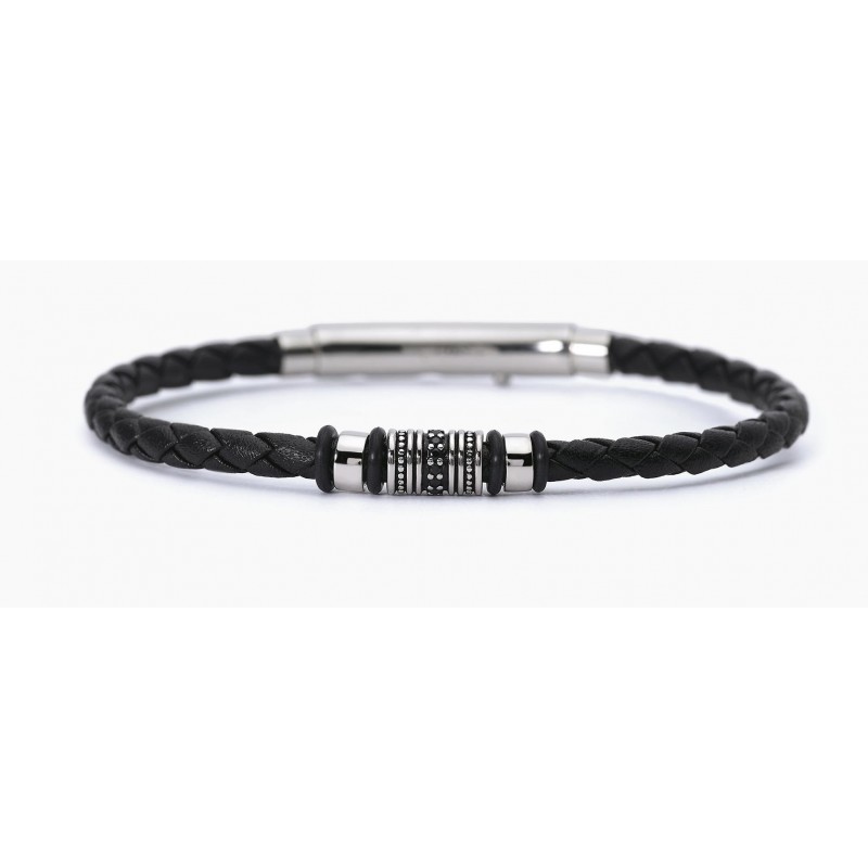 Descripción del Producto Pulsera para hombre en plata rodiada con cuero negro, acero y circonitas negras. • Diámetro de la circonita: 1,25 mm • Cierre de mosquetón • Talla única, longitud 22 cm • Material: Cuero, Plata 925, Acero, Circonitas