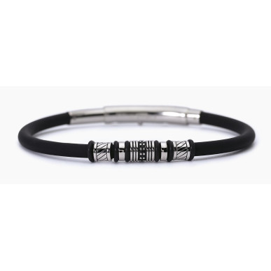 Descripción del Producto Pulsera para hombre en plata rodiada con silicona, acero y circonitas negras. • Diámetro de la circonita: 1,25 mm • Cierre de mosquetón • Talla única, longitud 22 cm • Material: Silicona, Plata 925, Acero, Circonitas