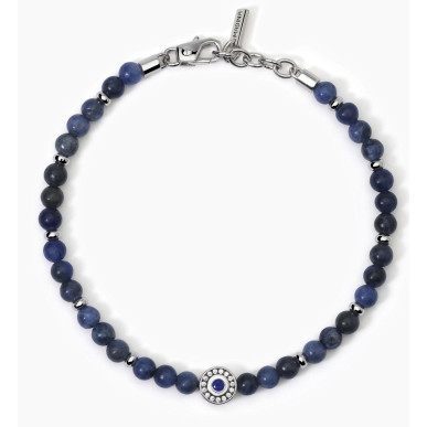 Descripción del Producto Pulsera ajustable para hombre en plata rodiada con sodalita y elemento central con circonitas azules y blancas. • Tamaño ajustable, longitud de 19 a 21 cm • Diámetro de sodalita: 4 mm • Diámetro de circonita azul: 2,5 mm • Diámetro de circonita blanca: 1 mm • Cierre de mosquetón • Material: Plata 925, Sodalita, Circonitas