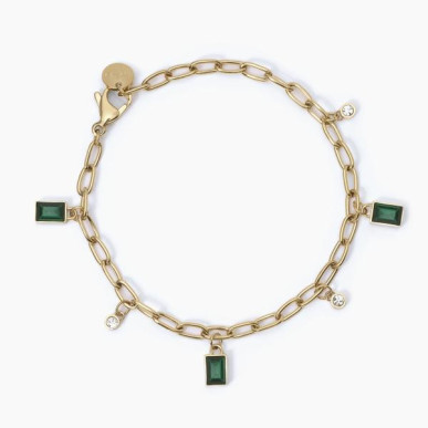 Pulsera de acero 316L con cadena forzatina alargada de 3 mm, con colgantes de esmeraldas sintéticas de 6x4 mm y cristales de Ø 2,5 mm, largo regulable de 16 a 19 cm