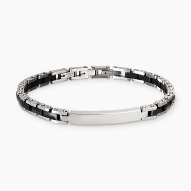 Brazalete de acero 316L con elemento central de 45x6 mm, elementos de cerámica negra de 8x3 mm, longitud ajustable de 19 a 21 cm