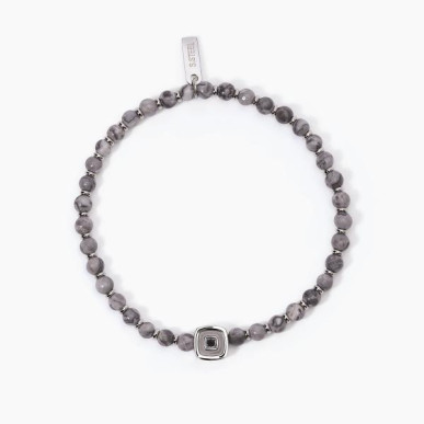 Pulsera elástica de acero 316L con elemento de corte cuadrado con PVD Gun Metal 8x8 mm, ágata gris Ø 4 mm y cristal negro Ø 1,75 mm, longitud 19 cm