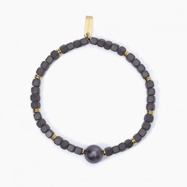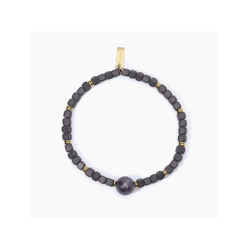 Brazalete de acero 316L con PVD amarillo, hematita de 4x4 mm y perla de concha negra Ø 10 mm, longitud 19 cm