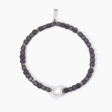 Pulsera elástica de acero 316L, hematita de 4x4 mm y perla de concha blanca Ø 10 mm, longitud 19 cm