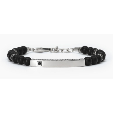 Descripción del Producto Pulsera para hombre en plata bruñida con esferas de ágata negra y placa con acabado diamantado y circonitas negras. • Tamaño ajustable, longitud de 19 a 21 cm • Diámetro de las esferas de ágata negra: 6 mm • Diámetro de las circonitas: 2 mm • Cierre de mosquetón • Material: plata 925, circonita negra, ágata negra • Acabado rodiado