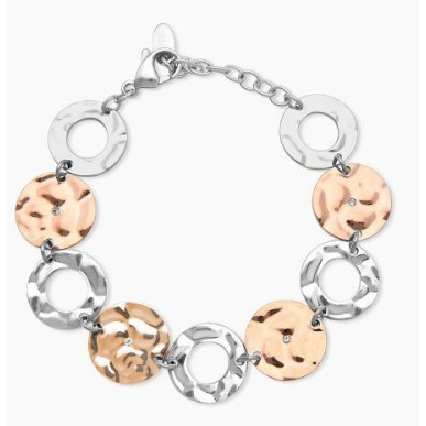 Pulseras mujer con botón de acero 316L con elementos martillados Ø 15 mm, elementos martillados con PVD rosa Ø 15 mm y cristales Ø 1 mm, longitud ajustable de 17 a 20 cm