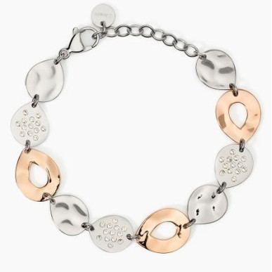 Pulsera de mujer en acero 316L con carrilleras de 11x13,5 mm, carrilleras martilladas de 11x13,5 mm y PVD rosa de 13,5x16,5 mm y cristales de Ø 1,5 mm, longitud ajustable de 16,5 a 19 cm