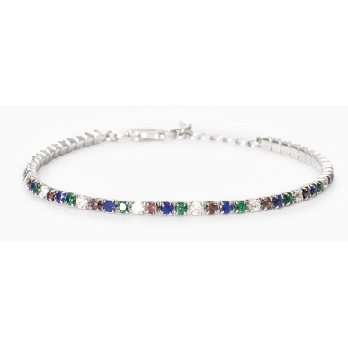 Descripción del Producto Pulsera tenis ajustable para hombre en plata rodiada con esmeraldas y zafiros sintéticos, circonitas blancas y circonitas marrones. • Diámetro de esmeraldas y zafiros sintéticos: 2,5 mm • Diámetro de circonitas: 2,5 mm • Cierre de mosquetón • Tamaño ajustable, longitud de 18,5 a 21 cm • Material: Plata 925, Esmeraldas sintéticas, Zafiros sintéticos, Circonitas