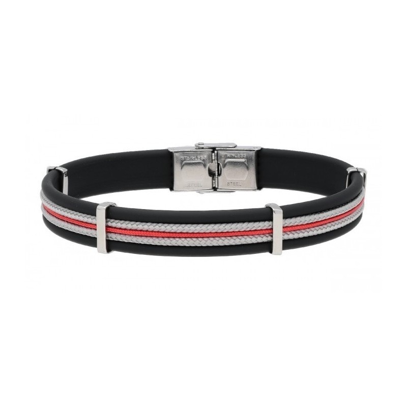 Pulsera para Hombre . Es una pulsera original de la marca Liska , para hombre de la colección Urban. Es un modelo elaborado en , nilón trenzado en color gris , naranja y con la base en caucho negro con adornos en acero antialérgico e inoxidable en color plateado. La longitud de la correa es de aproximadamente unos 21 cm y el cierre es de tipo seguridad. Ancho de 10,00 mm