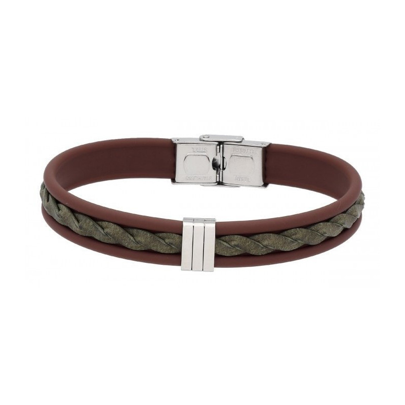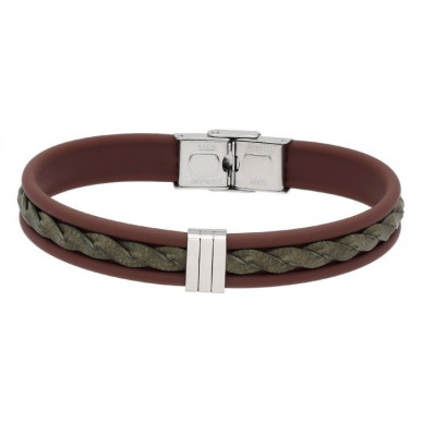 Pulsera para Hombre . Es una pulsera original de la marca Liska , para hombre de la colección Urban. Es un modelo elaborado en caucho marrón y piel trenzada en color verde con abalorios en acero y cierre es de tipo seguridad. Ancho de piel 10.00 mm