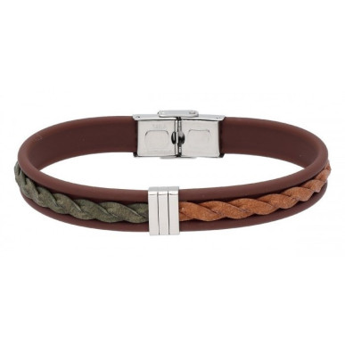 Pulsera para Hombre . Es una pulsera original de la marca Liska , para hombre de la colección Urban. Es un modelo elaborado en caucho marrón y piel trenzada en color verde y camel con abalorios en acero y cierre es de tipo seguridad. Ancho de piel 10.00 mm