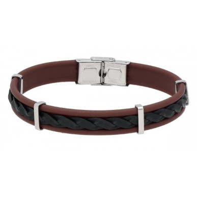 Pulsera para Hombre . Es una pulsera original de la marca Liska , para hombre de la colección Urban. Es un modelo elaborado en caucho marrón y piel trenzada en color negro con abalorios en acero y cierre es de tipo seguridad. Ancho de piel 10.00 mm