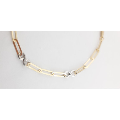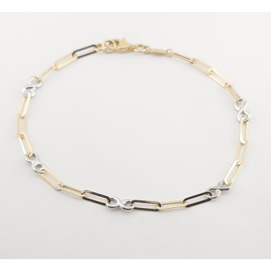 Pulsera para mujer bicolor en oro de 750mls 18kts largo de 19cm , pulsera con malla alargada en oro amarillo y con cinco infinitos en oro blanco.