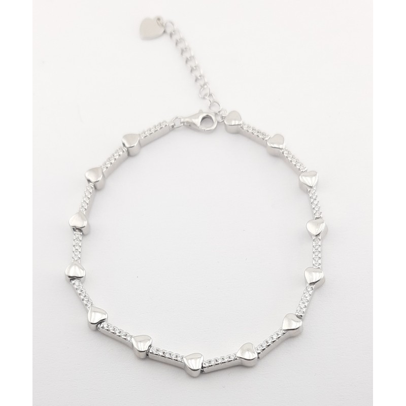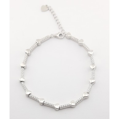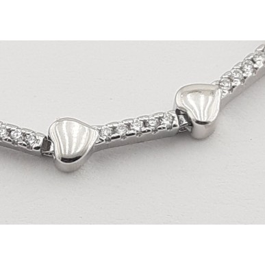 Pulsera con corazones y barritas con circonitas blancas en plata de ley 925mls ,corazón medida 4,30x4.66mm, medida ajustable desde 17,00cm a 20,00cm.