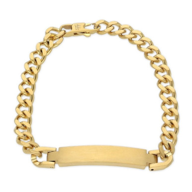 Pulsera para hombre en acero con IP dorado , tipo nomeolvides con malla barbada , Medida de la placa 31,00 x 7.80 mm Largo total 21 cm Grabación gratuita