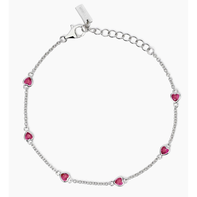 Pulsera ajustable de mujer en plata rodiada con cadena rolo y rubíes sintéticos talla corazón. • Tamaño de la cadena: 1,5 mm • Diámetro de los corazones: 3x3 mm • Largo ajustable de 16 a 19 cm • Material: Plata 925, Circonitas, Rubíes Sintéticos