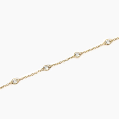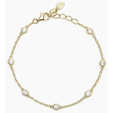 Pulsera de plata bañada en oro de 18k con puntos de luz de circonitas. • Engaste de piedras de circonita en bisel • Diámetro de las piedras de circonita: 3 mm • Cierre de mosquetón • Tamaño ajustable, largo de 16 a 19 cm • Material: plata 925, piedras de circonita • Acabado: baño de oro de 18k