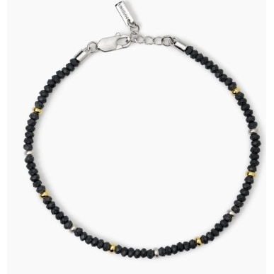Descripción del Producto Pulsera ajustable para hombre en plata rodiada con rondeles de hematita facetados e inserciones bañadas en oro amarillo. • Tamaño ajustable, longitud de 19 a 21 cm • Diámetro de las arandelas facetadas de hematita: 3,3 mm • Cierre de mosquetón • Material: plata 925, hematita • Acabado: baño de oro rosa de 18k