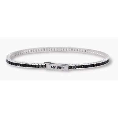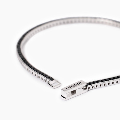 Pulsera de tenis para hombre en plata rodiada con circonitas negras de talla cuadrada. • Diámetro de la circonita: 2 mm • Cierre de resorte • Tamaño pequeño, largo 19 cm • Material: Plata 925, circonita