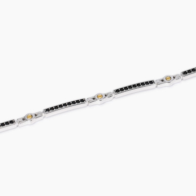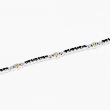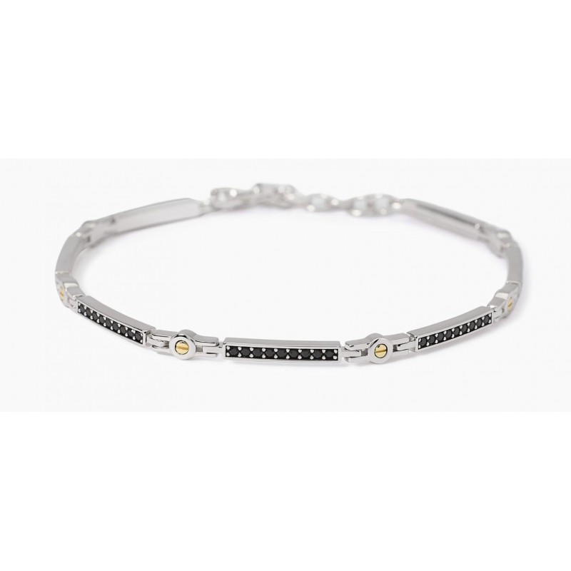 Pulsera ajustable para hombre con detalles bañados en oro y placas de plata rodiada y circonitas negras. • Tamaño de la placa: 15x2,5 y 9,5x2,7 mm • Diámetro de los tornillos bañados en oro: 2 mm • Diámetro de las circonitas: 1,5 mm • Largo regulable de 19 a 21 cm • Material: plata 925, circonitas • Acabado de los elementos: baño de oro de 18 quilates