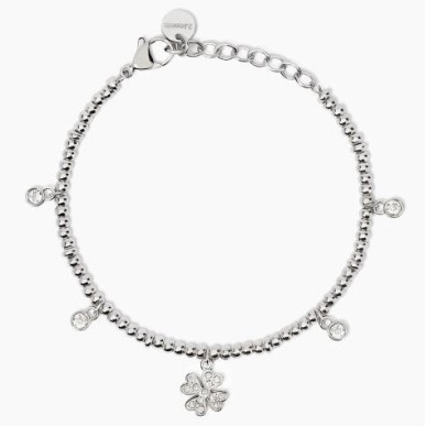 Pulsera de acero 316L con esferas de Ø 3 mm, colgante triple de cuatro hojas de 9,5x9,5 mm, cristales de Ø 3 y 1,25 mm, largo ajustable de 16 a 19 cm