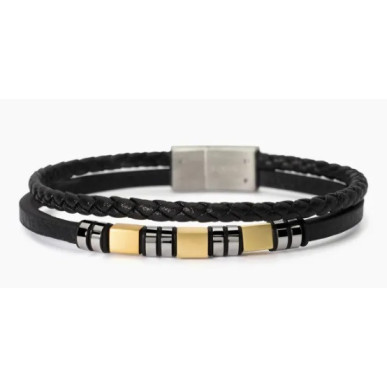 Pulsera de acero 316L con elemento de PVD dorado de 11x7 mm,con una tira de cuero trenzado y una cuero cuadrado , longitud ajustable de 19 a 21 cm