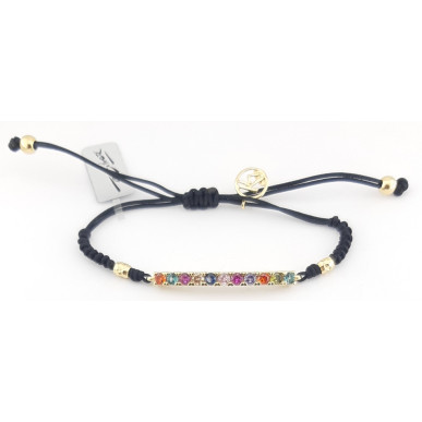 La pulsera está fabricada en plata de 1ª ley 925mls y piedras circonitas de colores y montura en chapado en oro . Ancho de la pulsera 3,60 mm largo 35,00mm ,terminado con hilo de rayón ajustable a la medida ..
