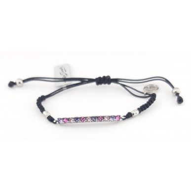 La pulsera está fabricada en plata de 1ª ley 925mls y piedras circonitas de colores . Ancho de la pulsera 3,40 mm largo 35,00mm ,terminado con hilo de rayón ajustable a la medida ..