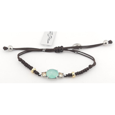Pulsera para mujer en plata de 1ª ley 925 mls de la marca Top Silver, piedra central ovalada calcedonia y dos en color brown y abalorios en baño de oro amarillo , bolas finales en plata , hilo Naylón en color marrón ajustable a la medida de la muñeca
