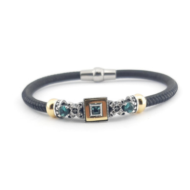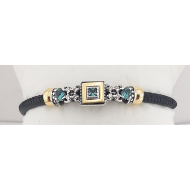 Pulsera para mujer en plata de 1ª ley 925 mls de la marca Top Silver, con cuadrado en baño de oro amarillo , Piedras de circonita verde , con abalorios en plata con rutenio y baño de oro amarillo , y la piel en color negro con un diámetro de 4mm y cierre con un potente iman.