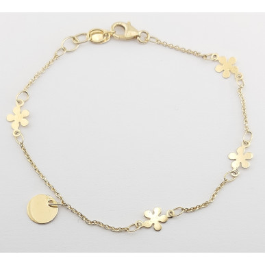 Pulsera para mujer fabricada en oro de 1ª ley 18 ktes 750mls ,con plaquita redonda colgante de 7,40mm de diámetro y con cuatro flores , medida ajustable desde 16,50 a 18,00cm