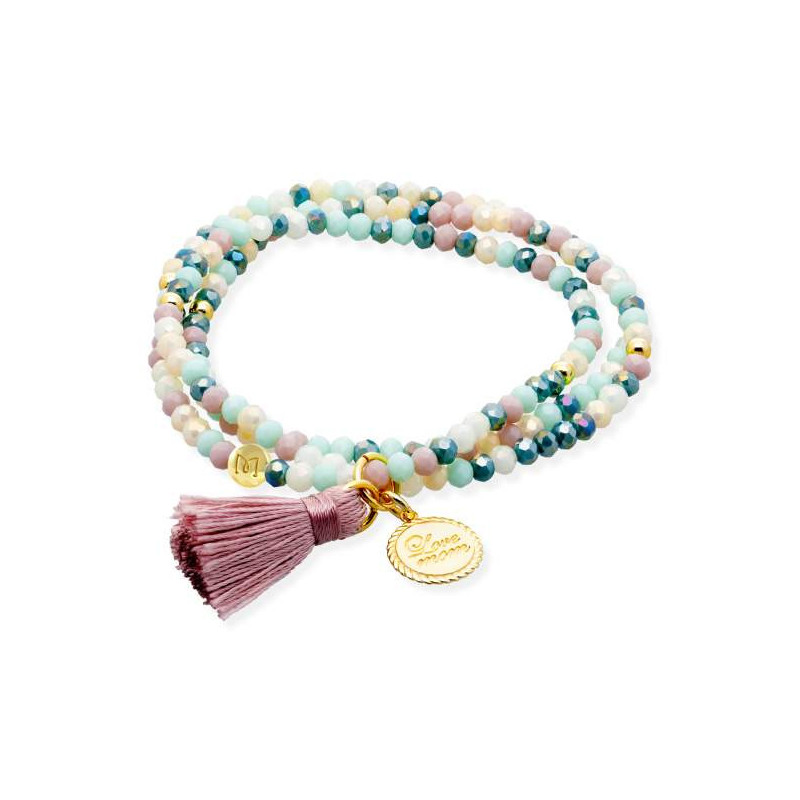 Pulsera de plata de primera ley (925) chapada en oro amarillo de 18kt, con nucleo de silicona elástica y cristal de strass facetado, con charm Mamá. Talla media de 17 cm. (51 cm. total)