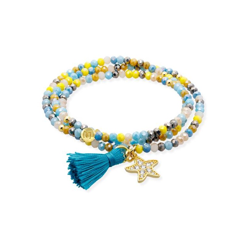 Pulsera de plata de primera ley (925) chapada en oro amarillo de 18kt, con nucleo de silicona elástica y cristal de strass facetado, con Estrella Mar. Talla media de 17 cm. (51 cm. total)