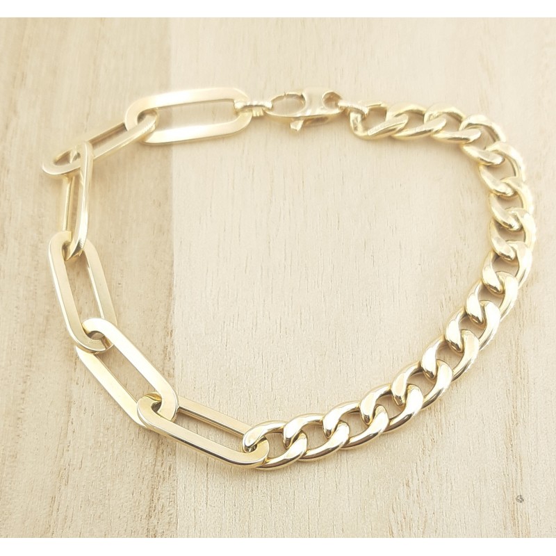 Pulsera para mujer en oro de 1ªley 18ktes 750mls , pulsera compuesta en eslabones huecos y diferentes tamaños y formas , las mallas barbadas miden de ancho 6.80mm y la malla oval 7.45mm , largo de la pulsera 20 cm .