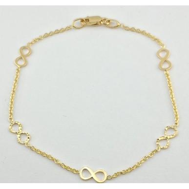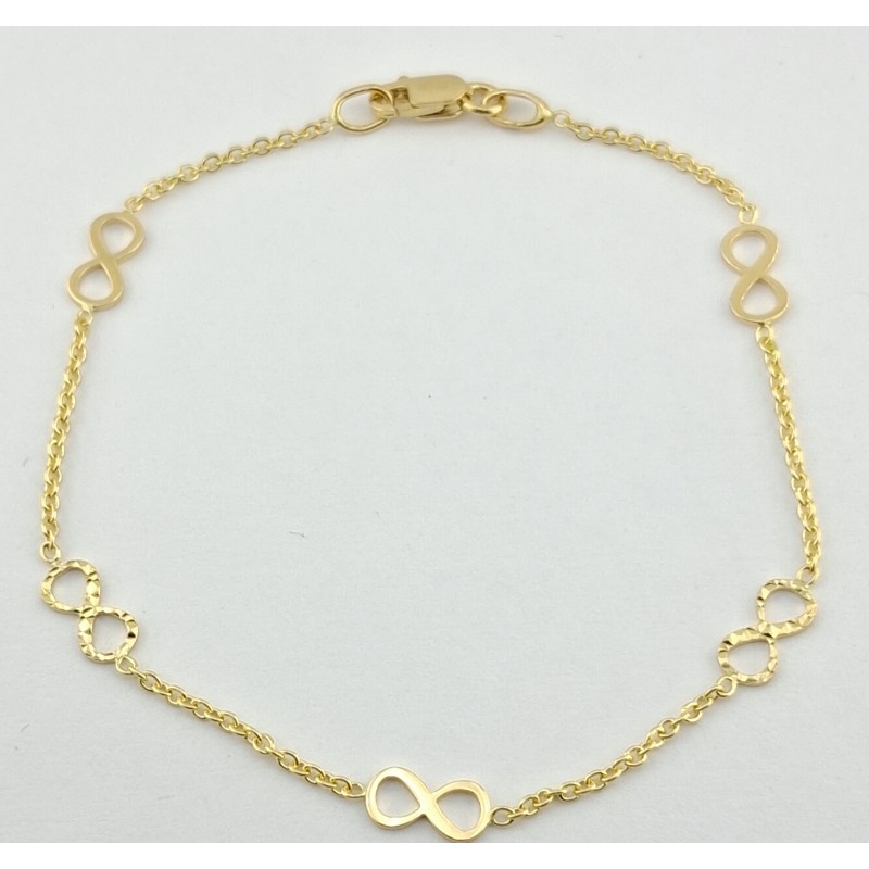 Pulsera para mujer en oro amarillo de 1ª ley 18kilates 750mls , pulsera con cinco infinitos calados y cadena forzada ,Largo total 18,00cms cierre con mosquetón..