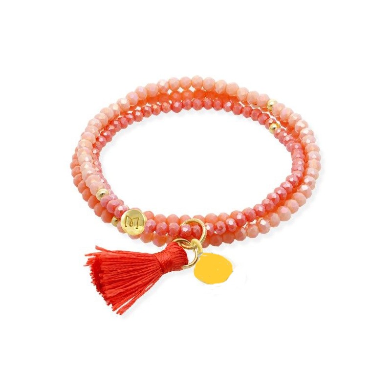 Pulsera Marina García para mujer de la colección Zen SALMON fabricada en plata bañada en oro amarillo compuesta por cristales Strass facetados multicolor con una chapa circular lisa ideal para realizar grabados personalizados. Esta pulsera de diseño elástico puede ser utilizada como tobillera y gargantilla